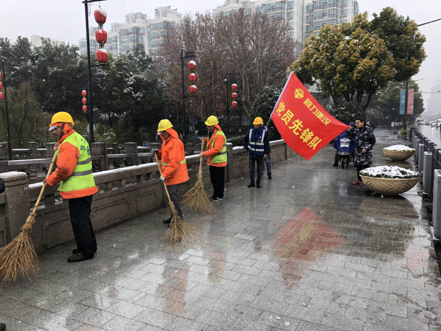 江北大道指揮部發(fā)動(dòng)黨員干部10人、車輛兩臺(tái),撒融雪劑1噸,對轄區(qū)內(nèi)主次干道、背街小巷、公交站臺(tái)、地鐵出入口以及小區(qū)內(nèi)的積雪進(jìn)行清理,確保道路、交通順暢,方便居民出行安全。